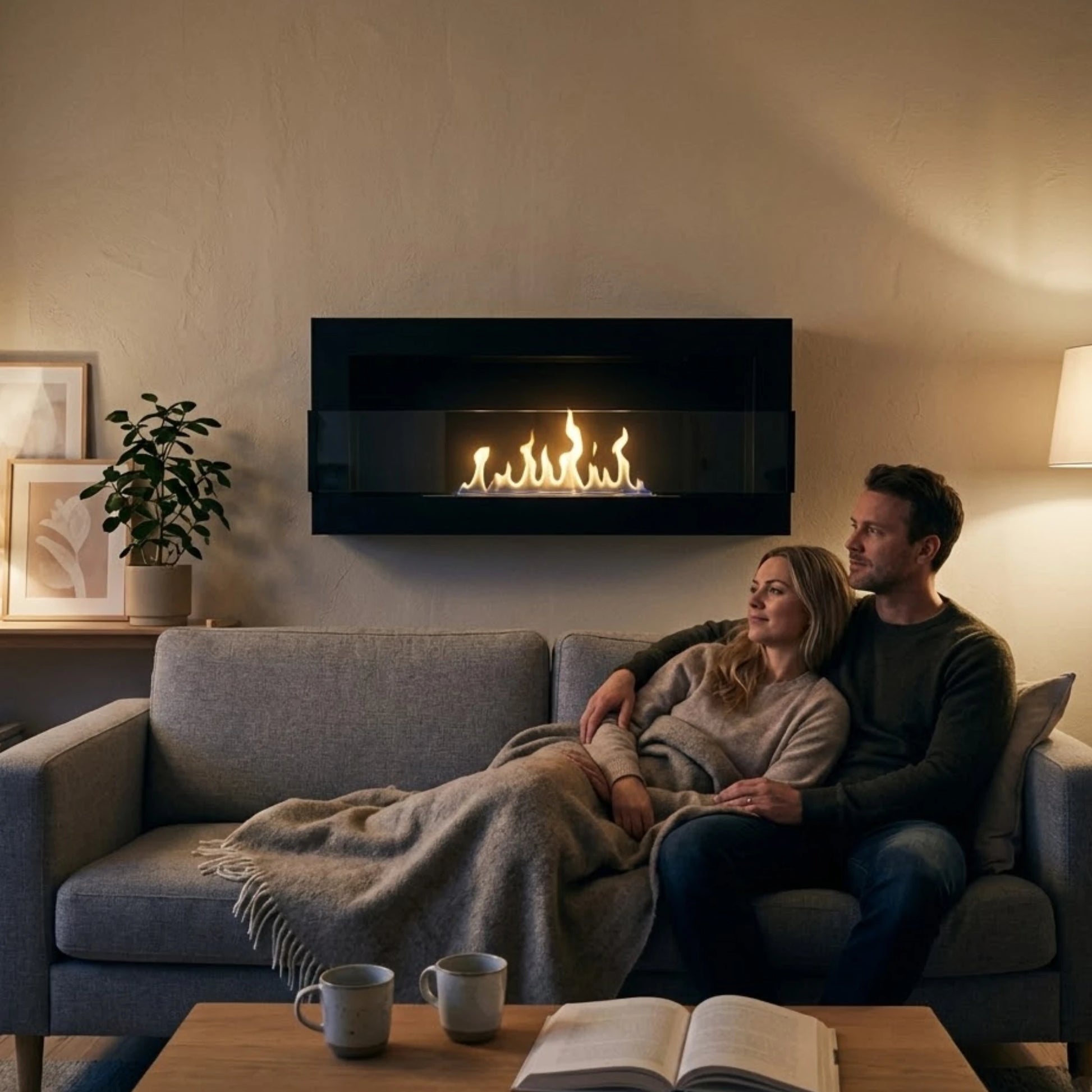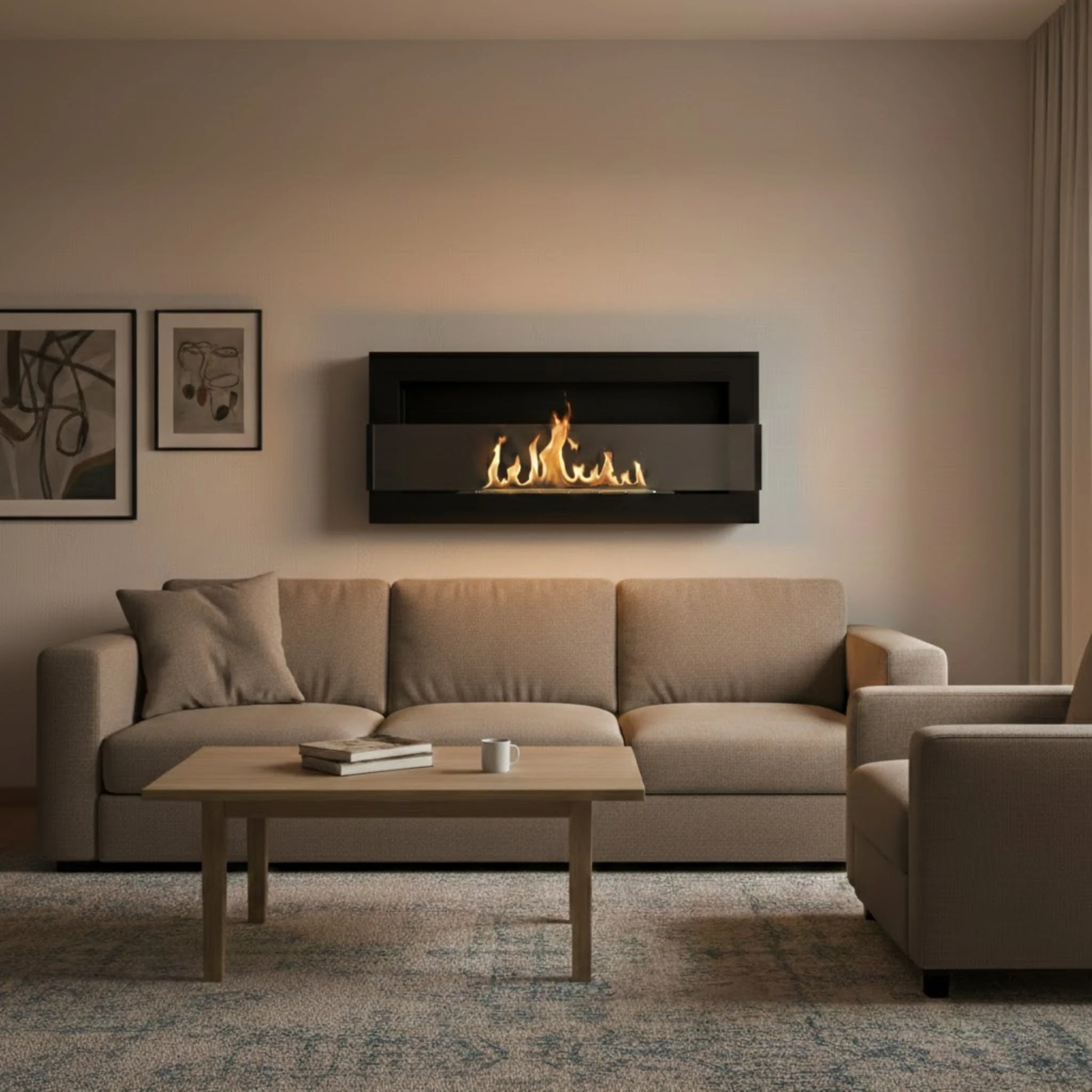 900x400 Væghængt Biopejs i Mat Sort er en elegant løsning, der giver varme uden at optage gulvplads. Uanset om du bor i en hyggelig lejlighed eller et rummeligt hus, skaber den en behagelig atmosfære og inviterer til afslappende stunder hele året. Forestil dig at læne dig tilbage i sofaen, mens flammernes rolige skær danser hen over væggen – uden røg, aske eller besværlig rengøring. Denne biopejs forener stilfuldt design med nem montering og miljøvenlig forbrænding, så du kan nyde en varm og indbydende stemning i dit hjem, hver gang du har brug for et pusterum.