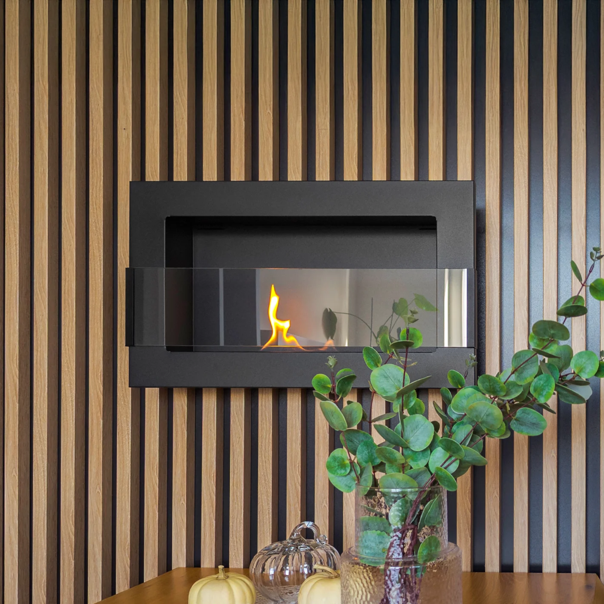 Vores væghængte biopejse præsenteres i en dyb matsort finish, der fremhæver deres sofistikerede silhuet og giver dit rum et moderne touch. Denne finish er ideel for at skabe en stemningsfuld atmosfære, hvor pejsen bliver rummets naturlige midtpunkt.